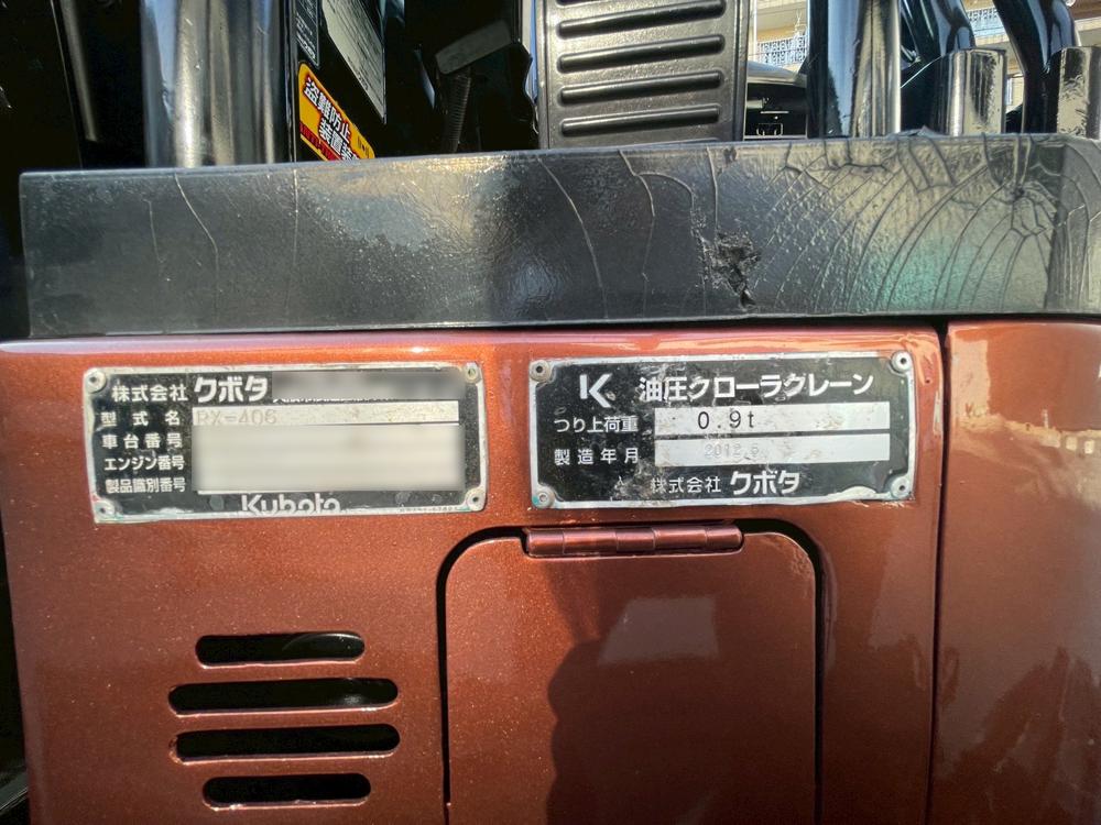 ・品名:クボタ製 ミニバックホー 0.11㎥ RX-406 ・メーカー:クボタ ・型式:RX-406 ・年式:2012 ・時間:2965h ・クレーン仕様:吊り上荷重0.9t ・塗装:オリジナルカラーメタリックブラウン |