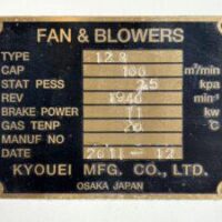 ・品名:共栄製作所製 段ボール破砕機 ・メーカー:共栄製作所 ・年式:2011年12月 ・動力:11 kW ・投入口寸法:W800×H320mm(蓋を閉めた状態 W800×H145mm) ・付属品:ダクト、電気図面、赤色灯 ・機械寸法:W2700×D1320×H2100 mm(折り畳みテーブルを開いた状態 W3060×D1320×H2100 mm) ■FAN&BLOWER ・設備名:カッターブロワー ・型番:12B ・処理風量:100 m3/min ・静圧:2.5 kPa ・回転数:1940min-1 ・動力:11 kW ・ガス温度:20℃ ・吸引口径:Φ460 mm ・機械寸法:W1700×D1280×H1310 mm ・機械重量:約700~800 kg |