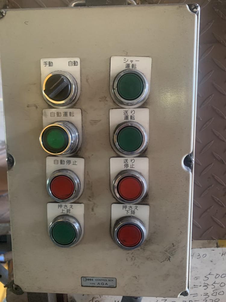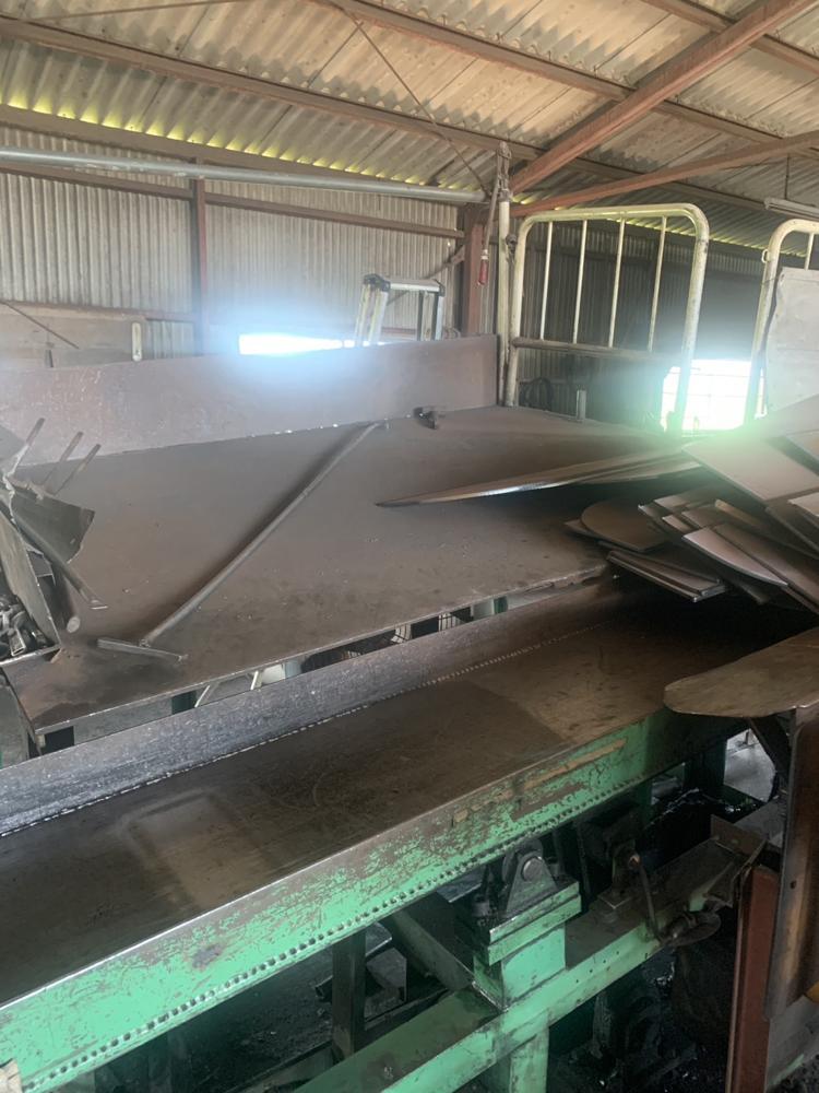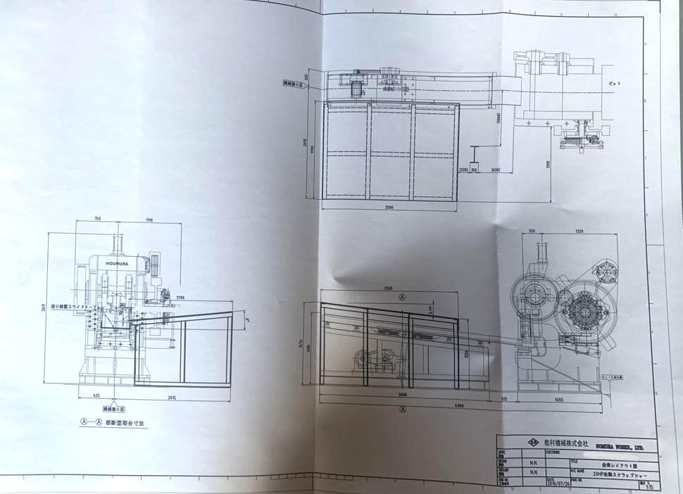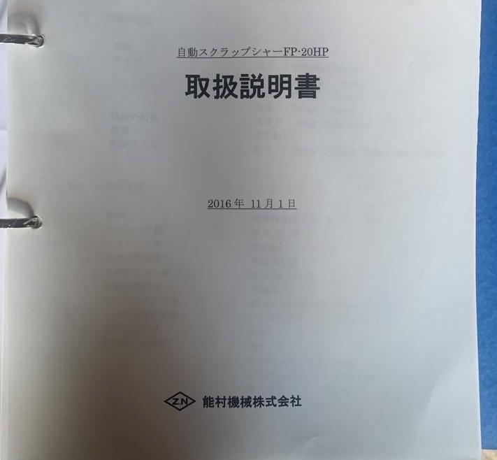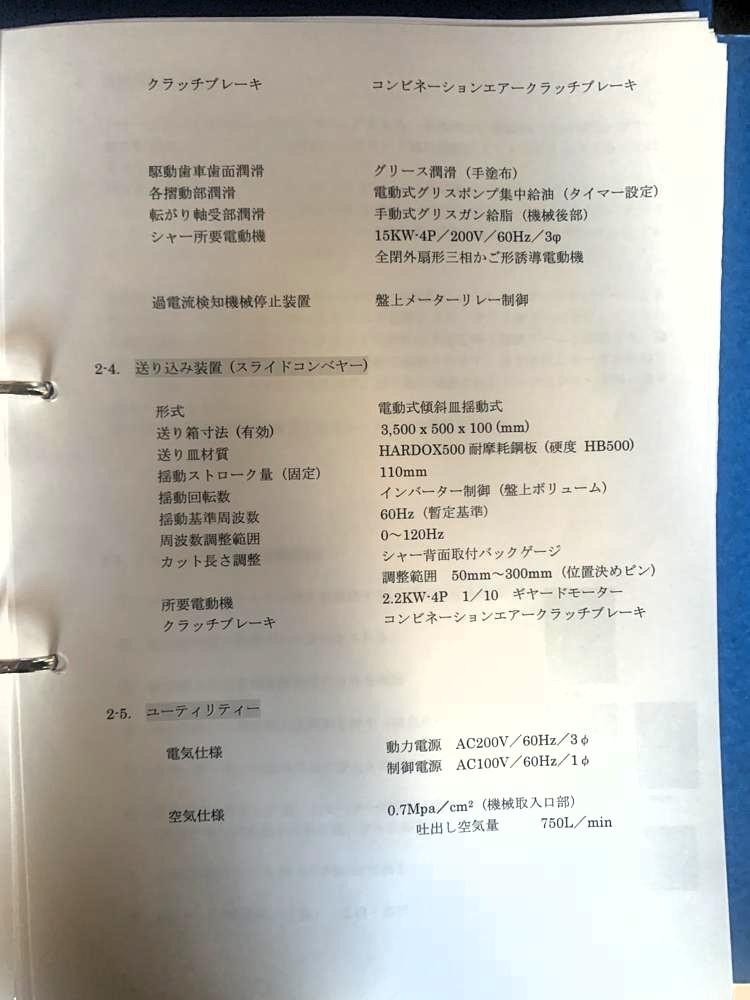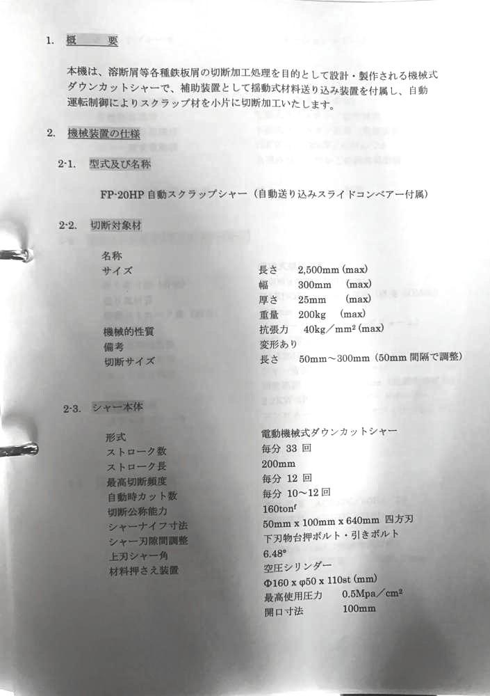 ・品名:能村機械製自動スクラップシャー ・メーカー:能村機械株式会社 ・型式:FP-20HP ・年式:2016年 ・材料サイズ:w300×t25×L2,500mm ・切断サイズ:50mm〜300mm切断能力:160ton ・電動機:15kW 200V ・総重量:約10ton 付属:自動送り込みスライドコンベア、予備刃物 ※カタンコロを切断していました |