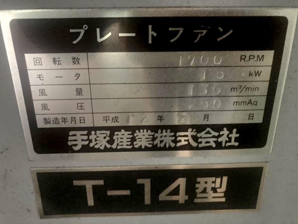 ・品名:手塚産業製プレートファン ・メーカー:(株)新東工機製作所 ・型式:T-14 ・年式:H12年 ・モーター:15kW ・風量:130m³/min ・風圧:250mmAq |