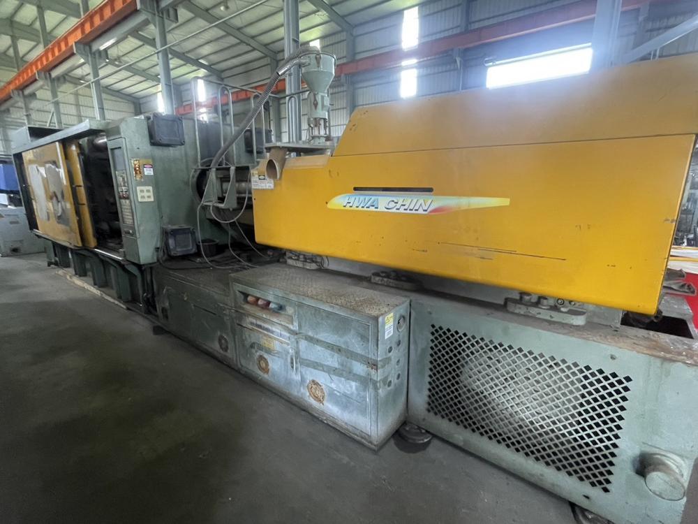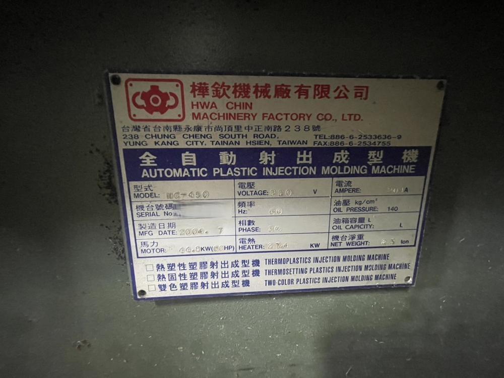・品名:Hwa Chin(樺欽總:台湾)製 HC450 射出成型機 ・メーカー:Hwa Chin Machinery Co., Ltd. (樺欽總公司:台湾) ・型式:HC450 ・年式:不明 ・型締力:450t |