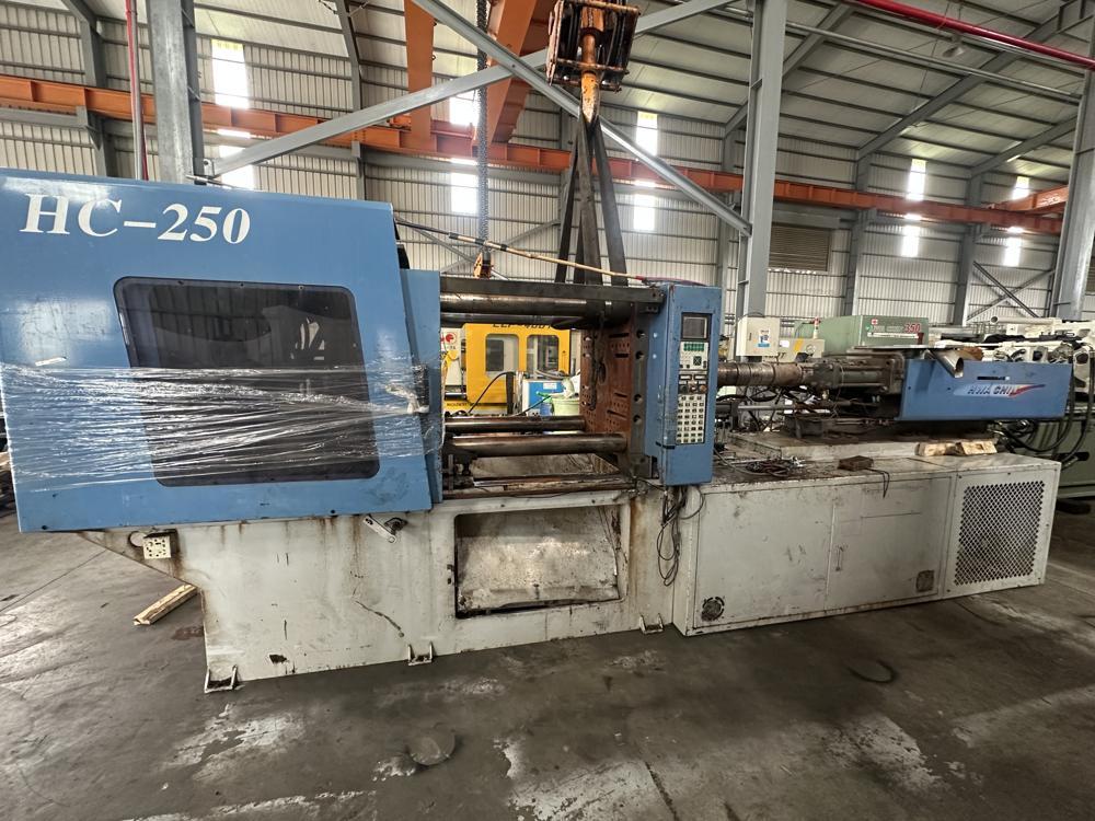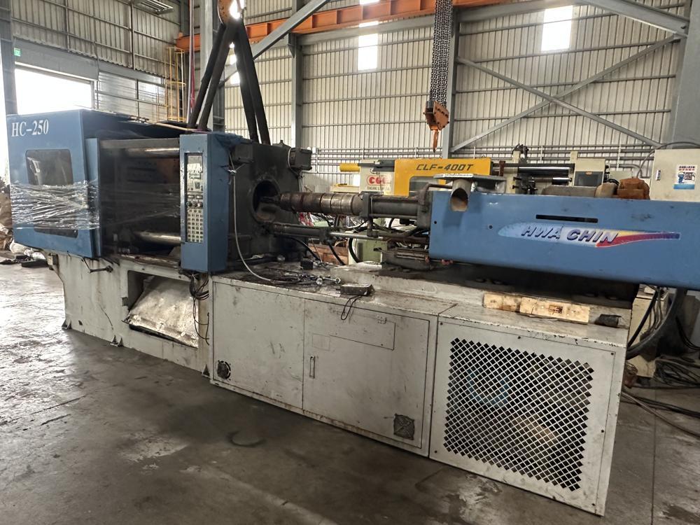 ・品名:Hwa Chin(樺欽總:台湾)製 HC250 射出成型機 ・メーカー:Hwa Chin Machinery Co., Ltd. (樺欽總公司:台湾) ・型式:HC250 ・年式:不明 ・型締力:250t |