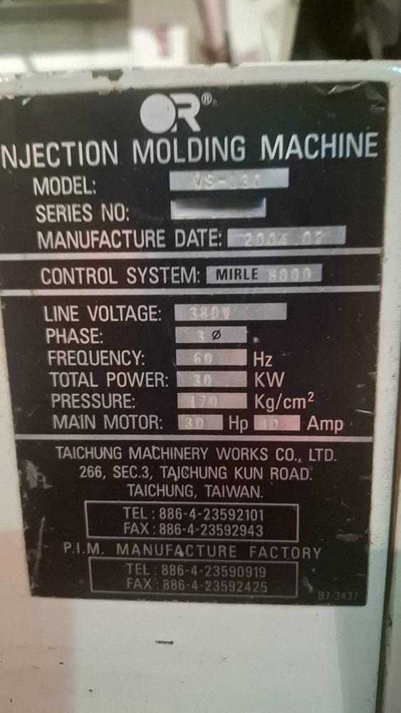 ・品名:Victor(台中精機:台湾)製 Vs-130 射出成型機 ② ・メーカー:Victor Taichung Machinery (台中精機廠股彬有限公司) ・型式:Vs-130 ・年式:2004年 ・型締力:130t |