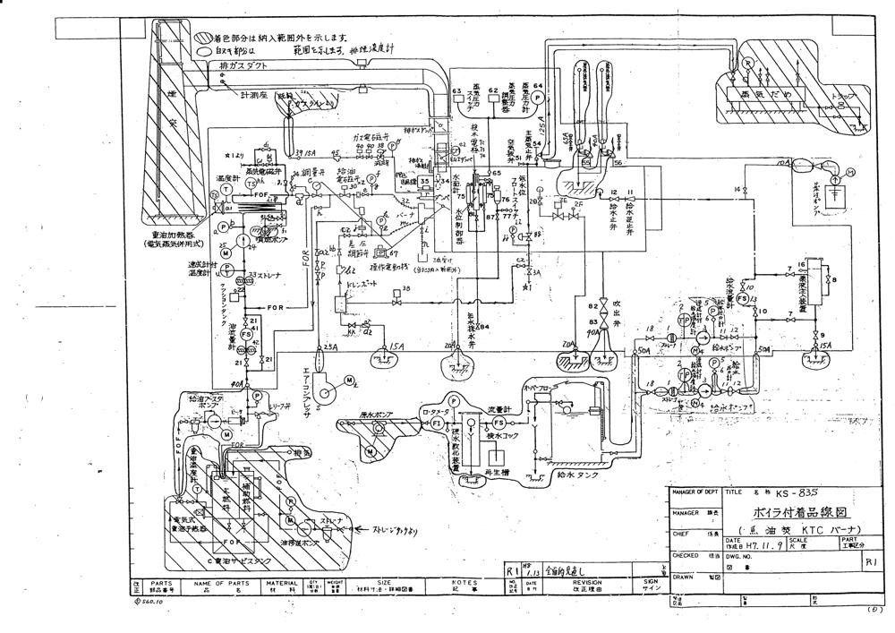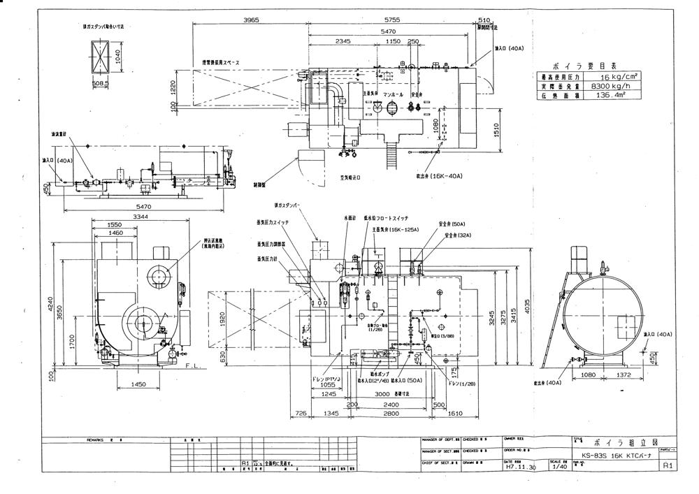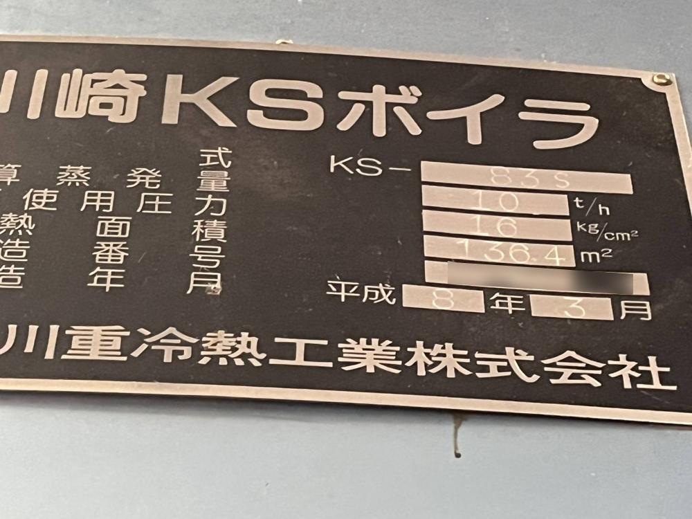 ・品名:川崎冷熱工業製ボイラー ・メーカー:川崎冷熱工業 ・型式:KS-83S ・年式:1996年 ・換算蒸発量:10t/h 圧力:16kg/cm² ・伝熱面積:136.4m² ※図面あり |