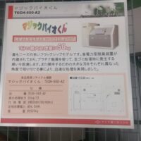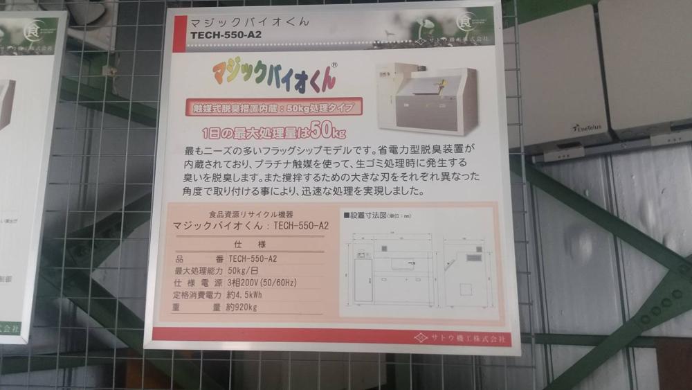 ・品名:マジックバイオくん TECH-550-A2 ・メーカー:テックコーポレーション ・型式:TECH-550-A2 ・年式:不明 ・最大処理能力:50㎏/日 ・仕様電源:3相200V(50/60Hz) ・定格消費電力:約4.5kWh ・重量:約920㎏ |