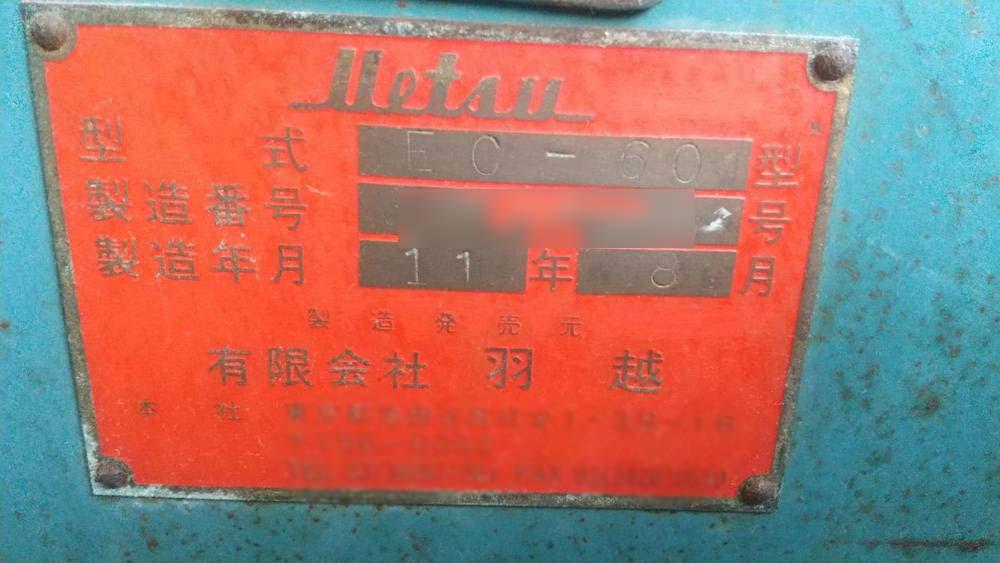 ・品名:羽越製自動紐掛機 ・メーカー:有限会社羽越 ・型式:EC-60型 ・年式:1999年 ・最大結束範囲:W610×H610×560mm ・遊動テーブル奥行:250mm |