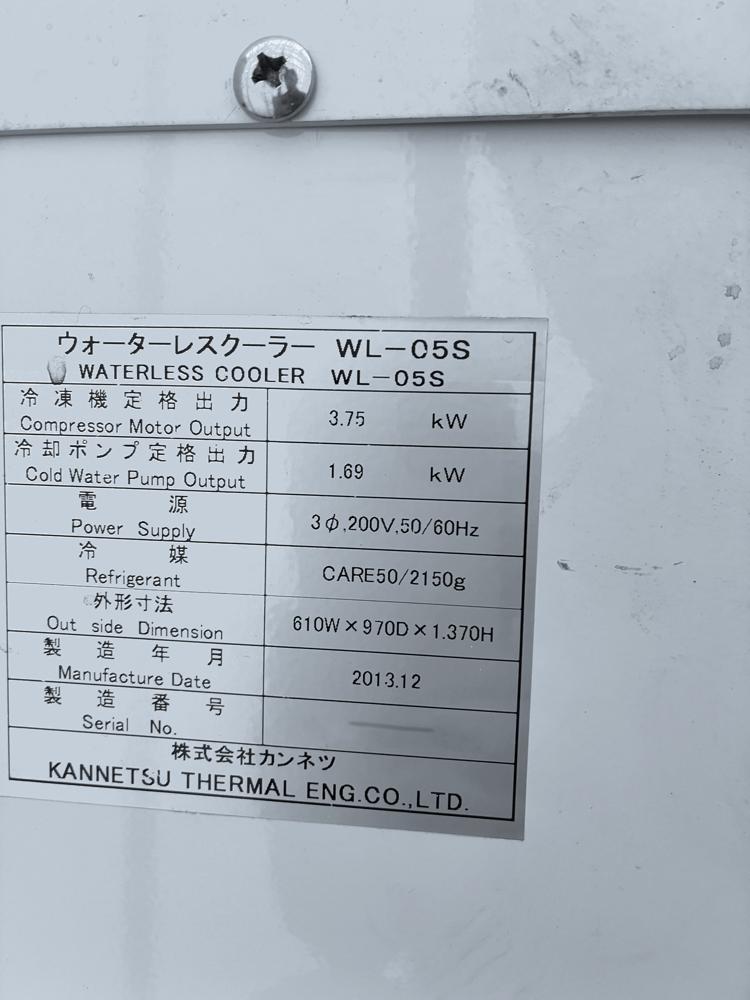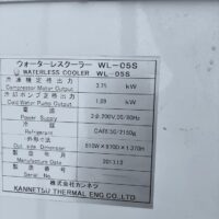 ・品名:チラー 冷却能力3.75kW 空冷式 ・メーカー:カンネツ ・型式:WL-05W ・年式:2013年 ・銘板参照してください。 |