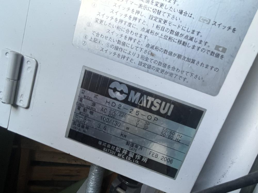 ・品名:松井製作所製ホッパードライヤー ・メーカー:松井製作所 ・型式:HD2-25kg-OP ・年式:2006 ・ヒーター:3.6kW ・電動機:100/130W |