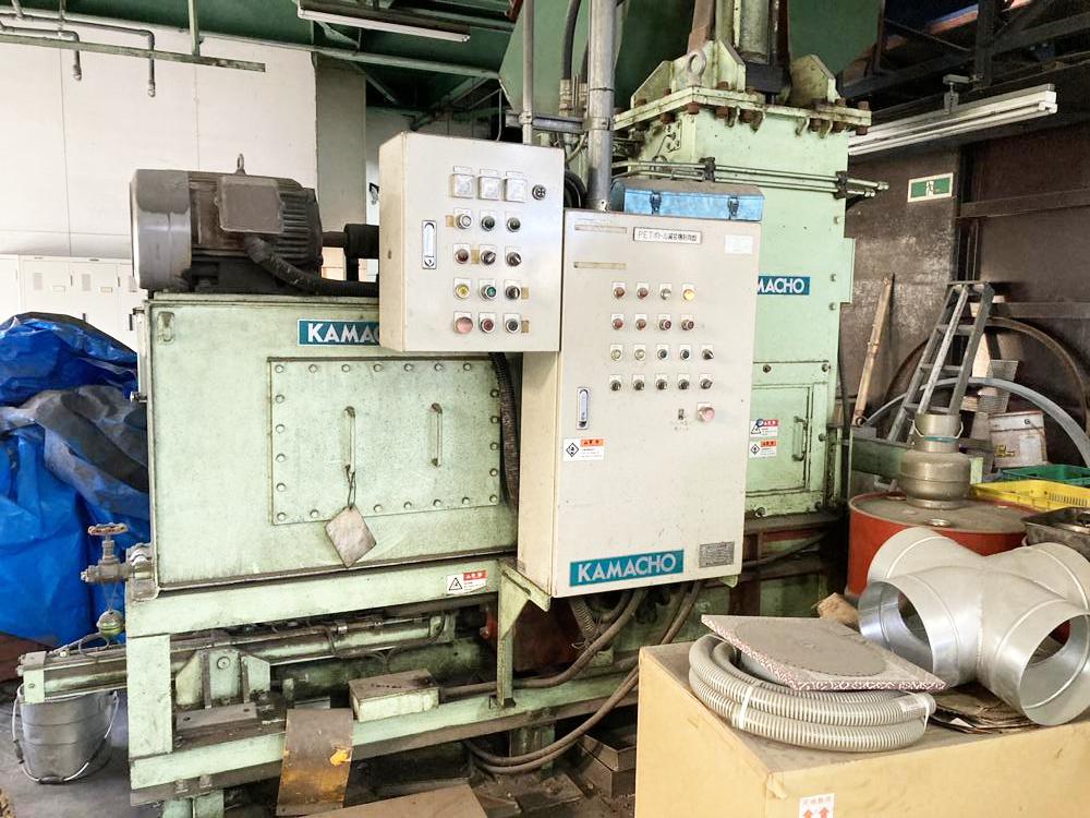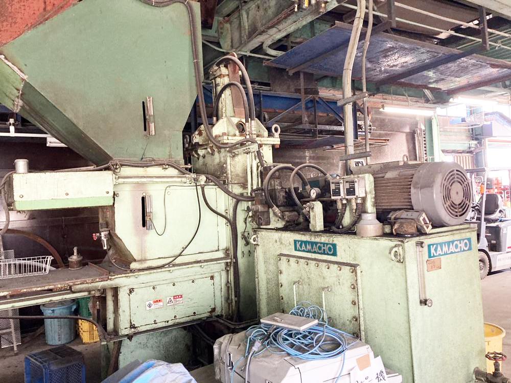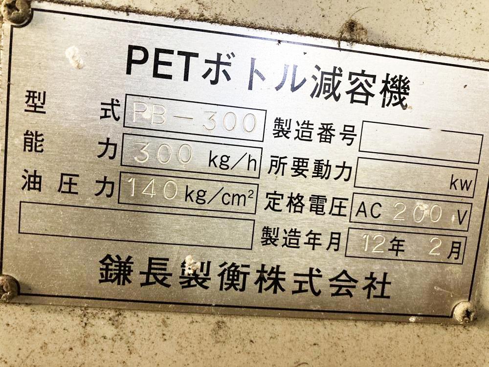 ・品名:鎌長製衡製 PETボトル減容機 ・メーカー:鎌長製衡(株) ・型式:PB-300 ・年式:2012年 ・圧縮方式:油圧駆動縦型一方締式 ・能力:300kg/h ・油圧力:140kg/㎝2 ・成型品寸法:600×400×350mm ・成型後のベール重量:約30~40kg ・定格電圧:AC200V ・電動機:7.5kW ※能力等の数値についてはメーカー公表値を参照しています。 |