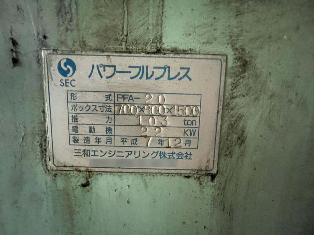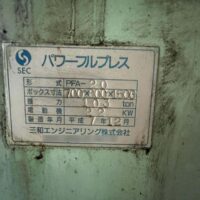No.6355E【中古】三和エンジニアリング製パワフルプレス(二方締め) 圧縮梱包機, 金属用プレス機 【価格】 ※お問い合わせ下さい。 【内容】 ・品名:三和エンジニアリング製パワフルプレス(二方締め) ・メーカー:三和エンジニアリング ・型式:PFA-20 ・年式:1995年 ・電動機:22kW ・推力:103トン 一言:二方締めプレス機が出てきました‼期間限定での案内です探されていた方は是非この機会に!! 【条件】 現状置場渡し、保証なし、売り切れ御免、ご発注時一括現金振込 【掲載日】 2026年4月14日 この機械に関するお問い合わせ Related Posts No.1916I【中古】縦型圧縮梱包機 ブラミダンHDX50 No.5113S【中古】カンペコプレス機 CP-35N3 No.2689S【中古】 缶ビン選別圧縮機 リサイクル4