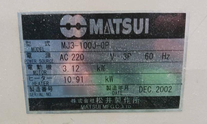 ・品名:除湿乾燥機 仕込み100kg ・メーカー:松井製作所 ・型式:MJ3-100J-OP ・年式:2002年 ・乾燥機の窓が取れています |