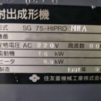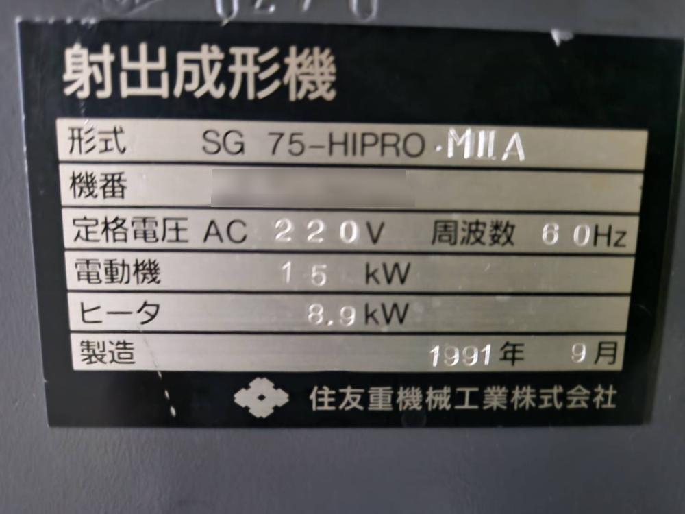 ・品名:住友 射出成型機75t ・メーカー:住友重機工業 ・型式:SG 75-hipro MⅢA ・年式:1991 ・油圧 |
