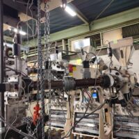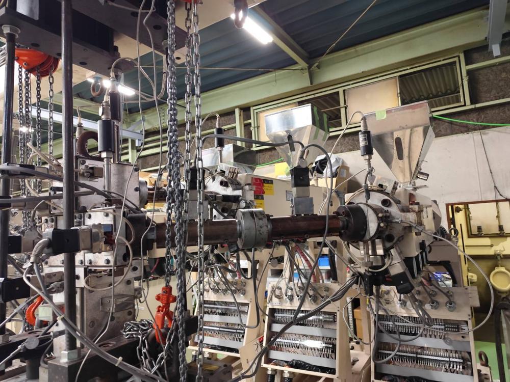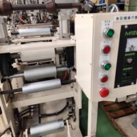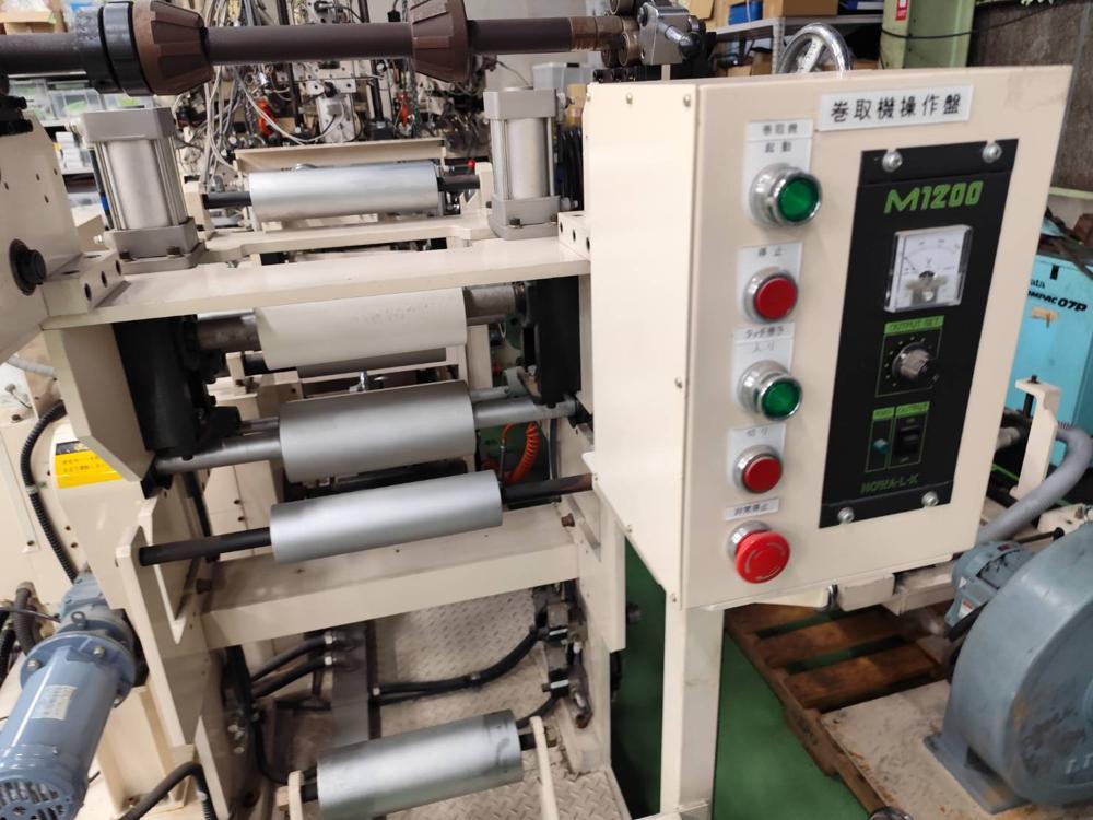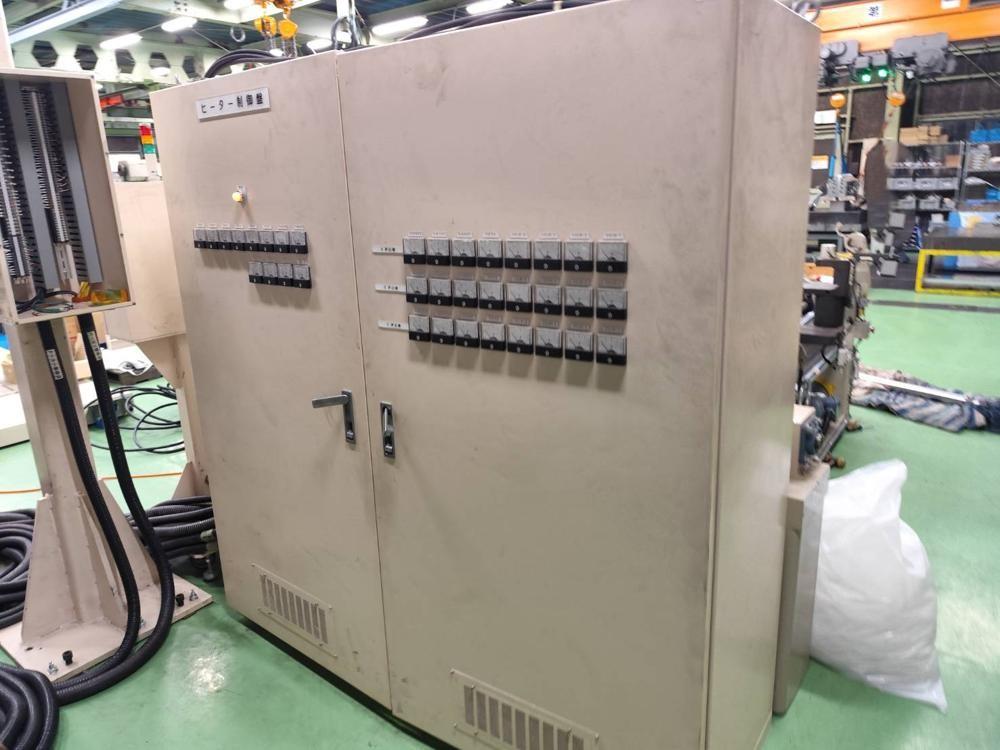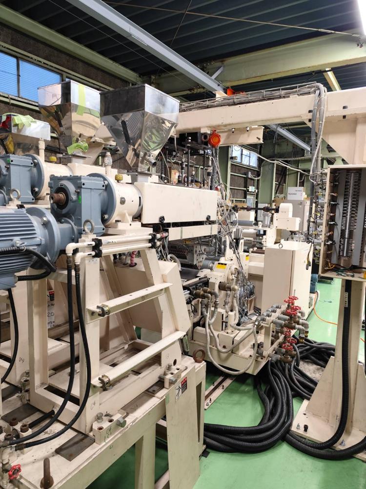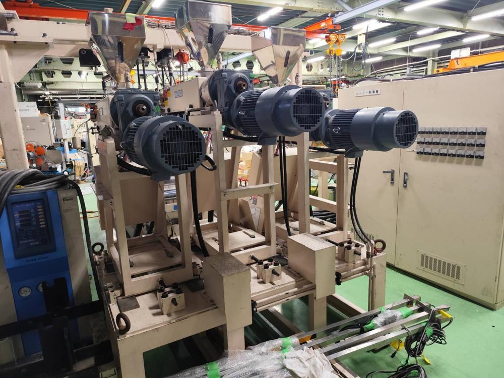 ・品名:ジーエムエンジニアリング製3種3層フィルム成形ライン ・メーカー:ジーエムエンジニアリング ・型式:M7821 ・年式:2010年10月 ・押出機:φ35ーL/D 24 *3台(A/B/C) ・モーター:3.7kW(3台) ・加熱方式:ヒーター ・冷却方式:空冷(ブロワー) ・温調整: ・ZONE シリンダ4/アダプタ1/フィードパイプ3 合計8ZONE/台 ・押出機3台合計 24ZONE Tダイ ・リップ幅:300mm ・温調:9ZONE ・流路:シングルマニホールド(FB方式多層) FB ・構成:3種3層 ・温調:2ZONE ロール成形機 ・ロール面長:L300 ・第一冷却ロール:φ300 鏡面ロール ・タッチロール:φ150 耐熱ゴムロール ・バックアップロール:φ110 ・耳切断カッター 繰り出し装置 ・繰り出し装置1:エアシャフト固定+インバーターモーター ・繰り出し装置2:エアシャフト固定 ・除電装置 ・巻取り機 |
