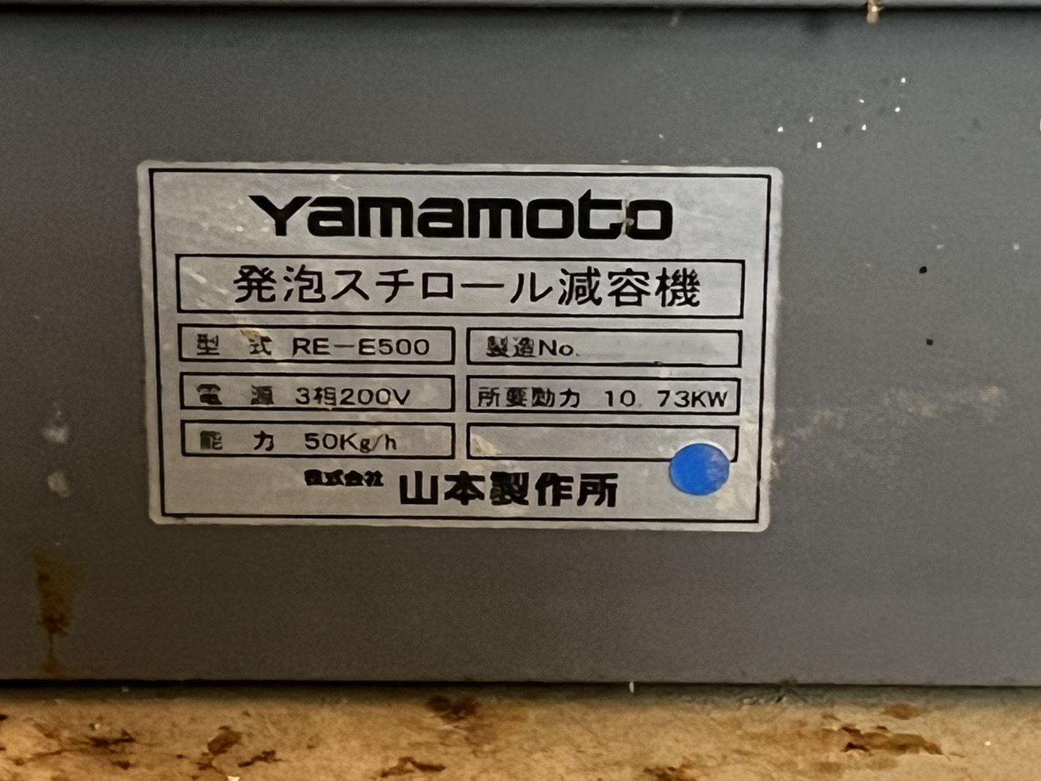 ・品名:山本製作所製 発泡スチロール減容機 ・メーカー:山本製作所 ・型式:RE-E500 ・年式:不明 ・電源:3相200V ・能力:50㎏/h ・動作確認可能 |